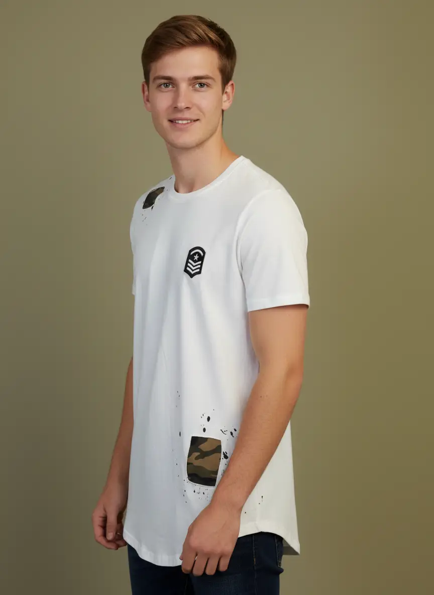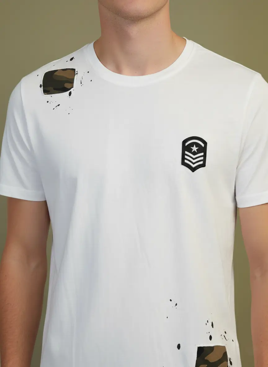Zwei zusätzliche Army-Patches mit schwarzen Farbspritz-Effekten verleihen dem Shirt einen rauen, urbanen Charakter.